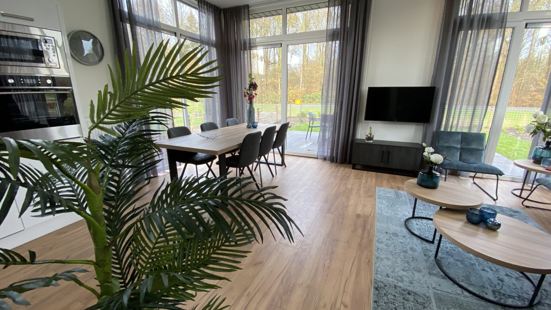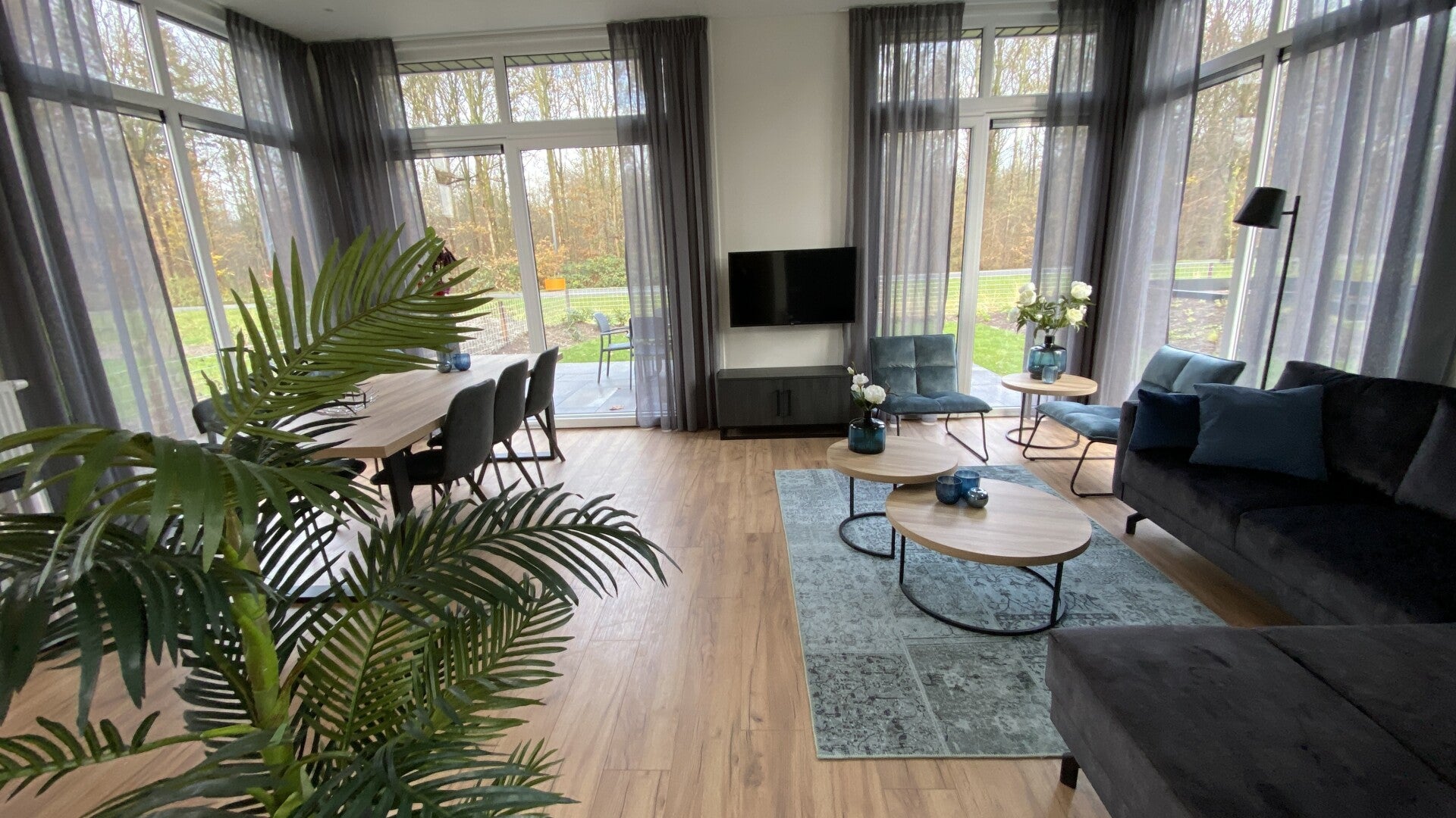 - Volledig ingerichte woonkamer met een loungebank in hoekopstelling, twee heerlijke fauteuils en een grote eettafel met zes comfortabele stoelen